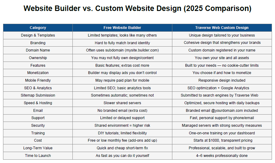 Free website builders have come a long way, and for some businesses they make sense — but they come with trade-offs.